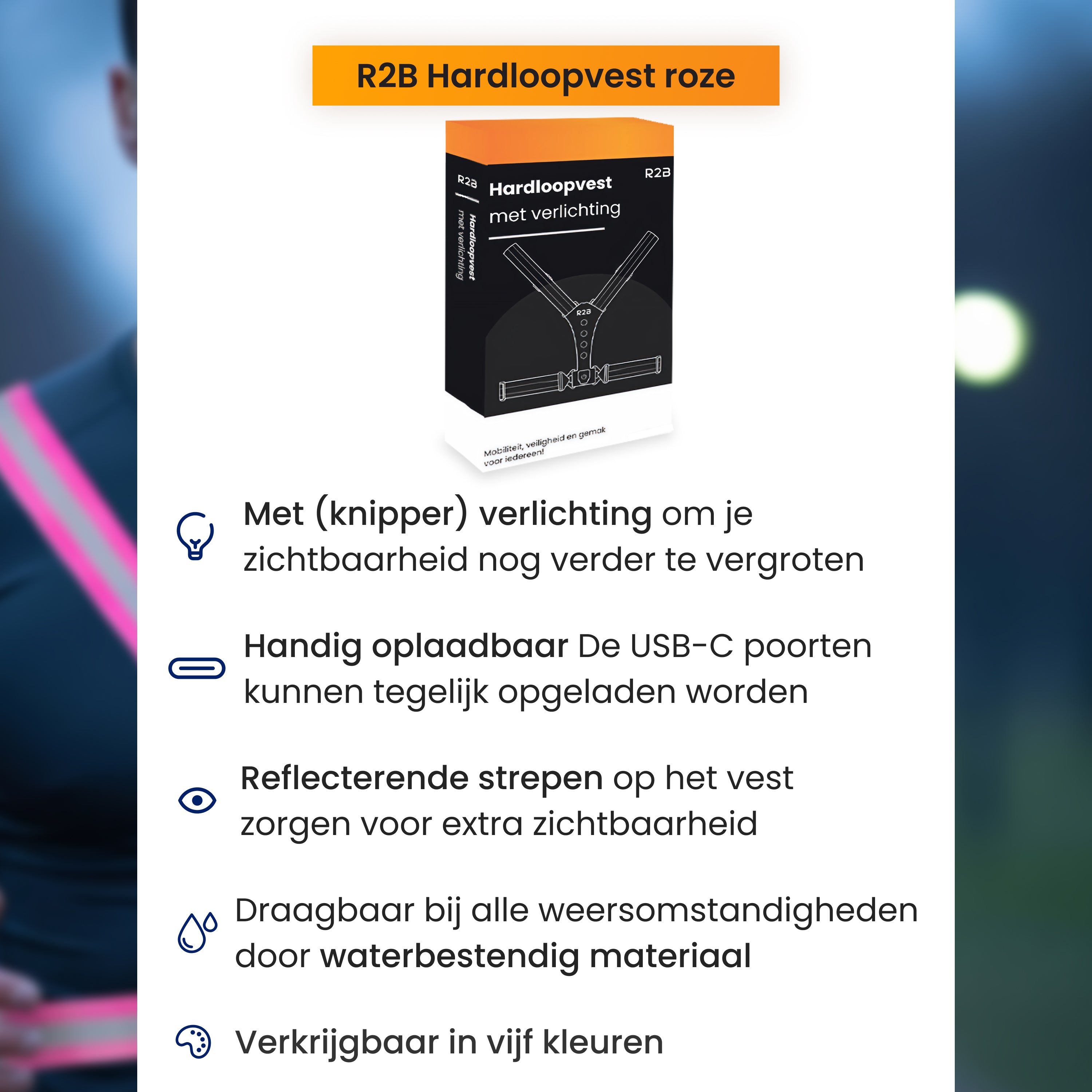 Wil je veilig en comfortabel hardlopen in het donker? Het R2B reflecterende hardloopvest met verlichting zorgt dat je altijd goed zichtbaar bent. Dankzij de USB-C oplaadbare verlichting hoef je geen batterijen te vervangen. De verstelbare pasvorm sluit mooi aan op je lichaam en het reflecterende materiaal maakt je extra zichtbaar voor automobilisten en andere weggebruikers!
