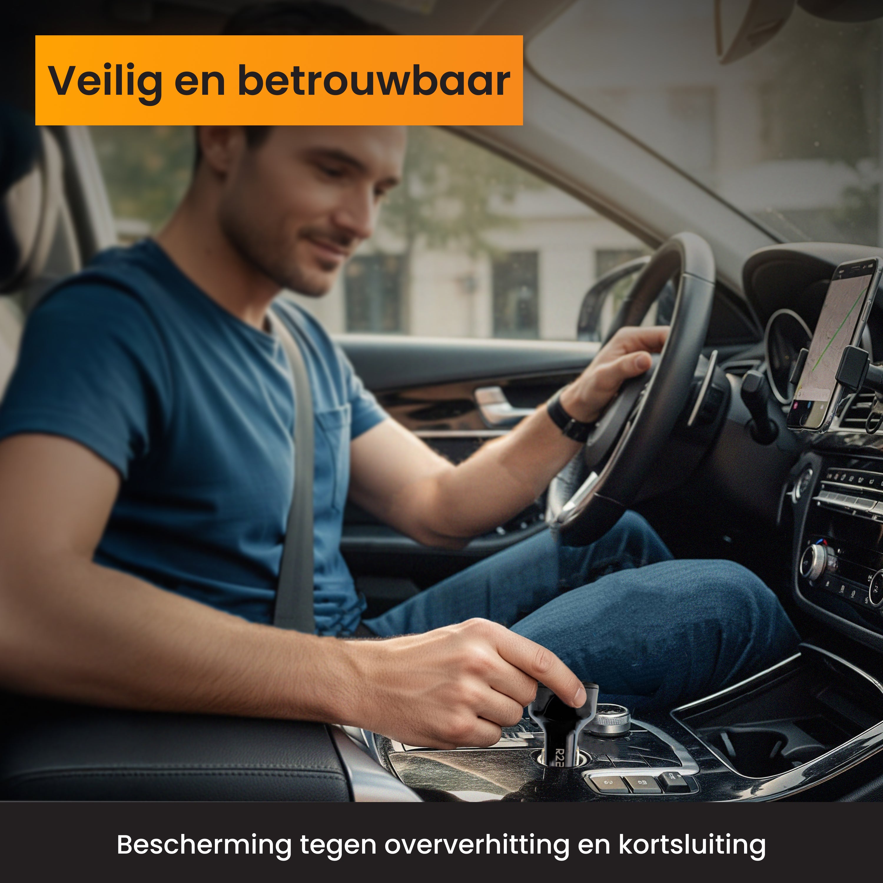 Charge your phone, tablet, or navigation system on the go? With this compact R2B car charger that plugs into your cigarette lighter, you'll never run out of power again. Thanks to two USB-C ports with Power Delivery and two USB-A ports with Quick Charge 3.0, you can charge up to four devices simultaneously. The elegant design fits effortlessly into any dashboard and features smart protection against overheating, overvoltage, and short circuits. Ideal for everyday use, vacations, or business trips!