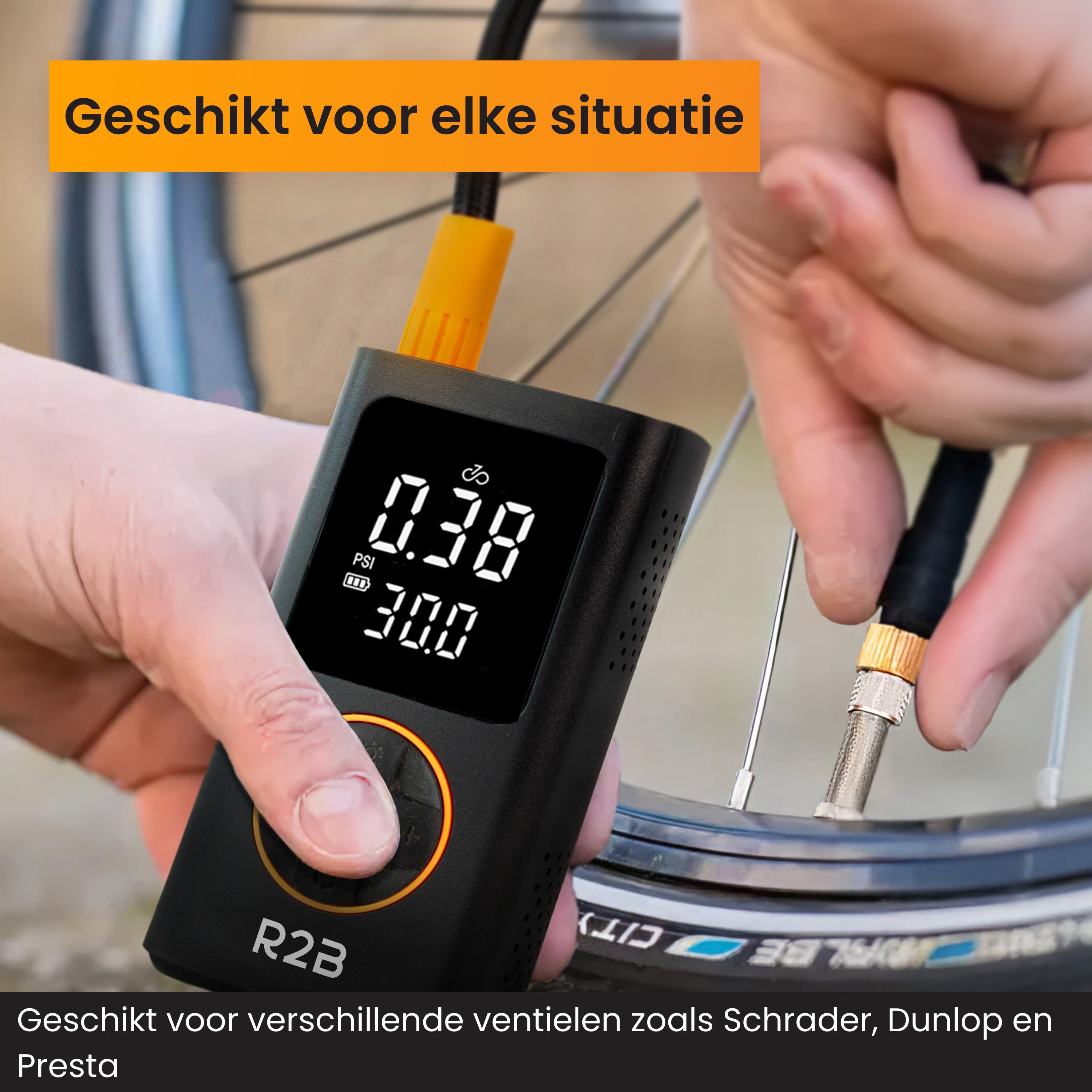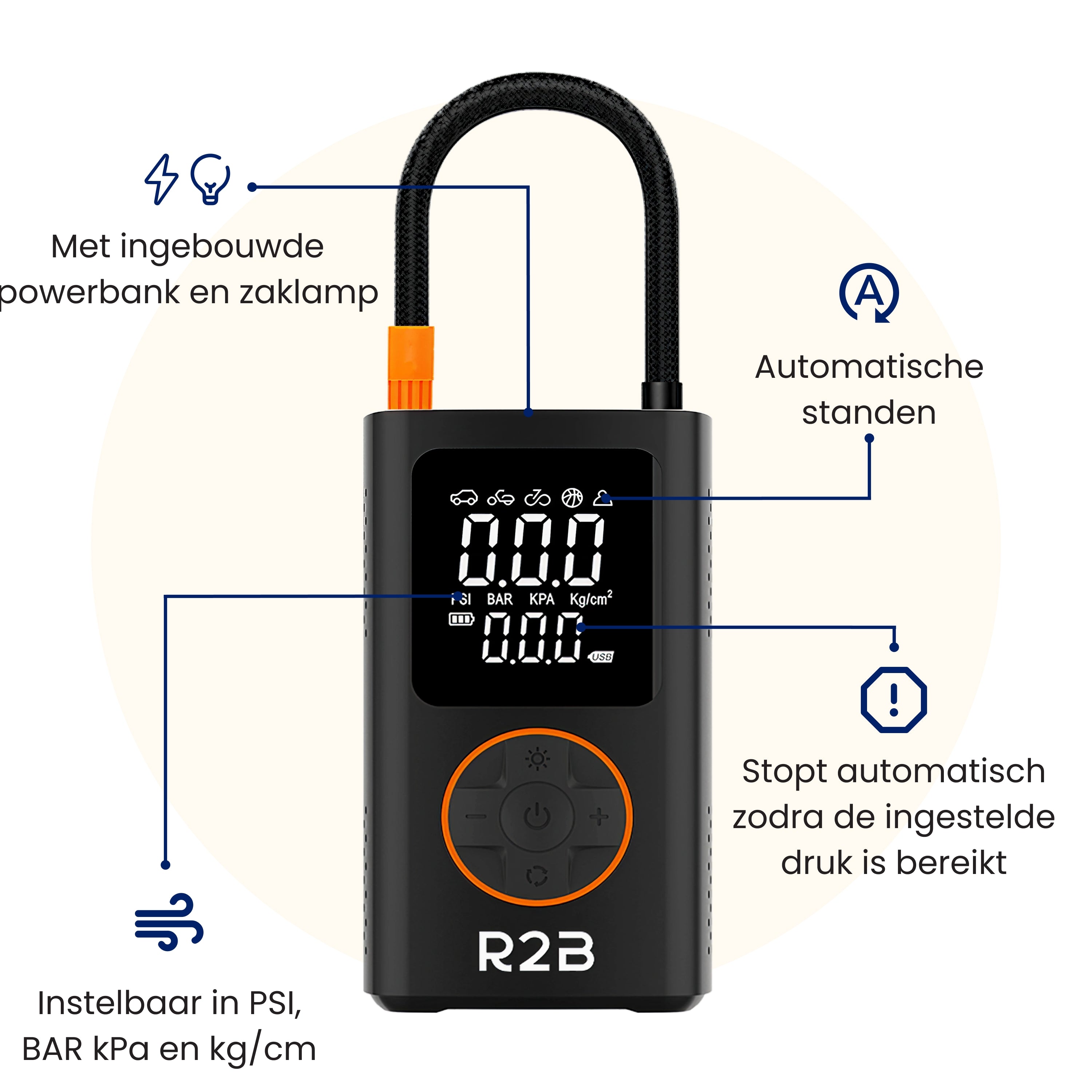 Do you ever find yourself on flat tires, or do you simply want to ensure your bike, scooter, or car always has the correct pressure? The R2B electric pump makes it easy to inflate anywhere. Compact enough to take with you, yet powerful enough to quickly inflate any type of tire or inflatable product. Whether it's your bike, your sports ball, or an air mattress on vacation, this smart air compressor will always keep you moving!