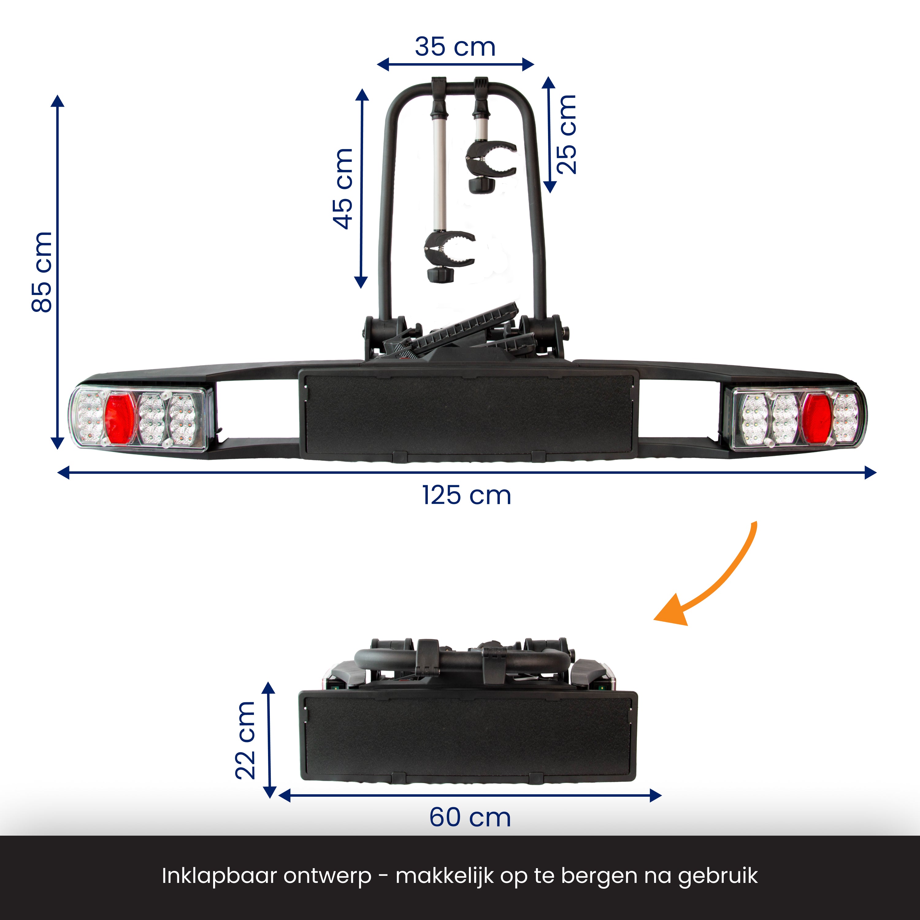 The R2B bike carrier for 2 bikes is your reliable travel companion for weekend rides, vacations, or sporting adventures. Whether you're carrying an e-bike, mountain bike, road bike, or city bike, this robust carrier offers a secure grip, easy tow bar mounting, and extra convenience thanks to its clever tilt and fold mechanism. This way, you can easily access your trunk even with bikes on the back. Safe, practical, and completely ready for the road!