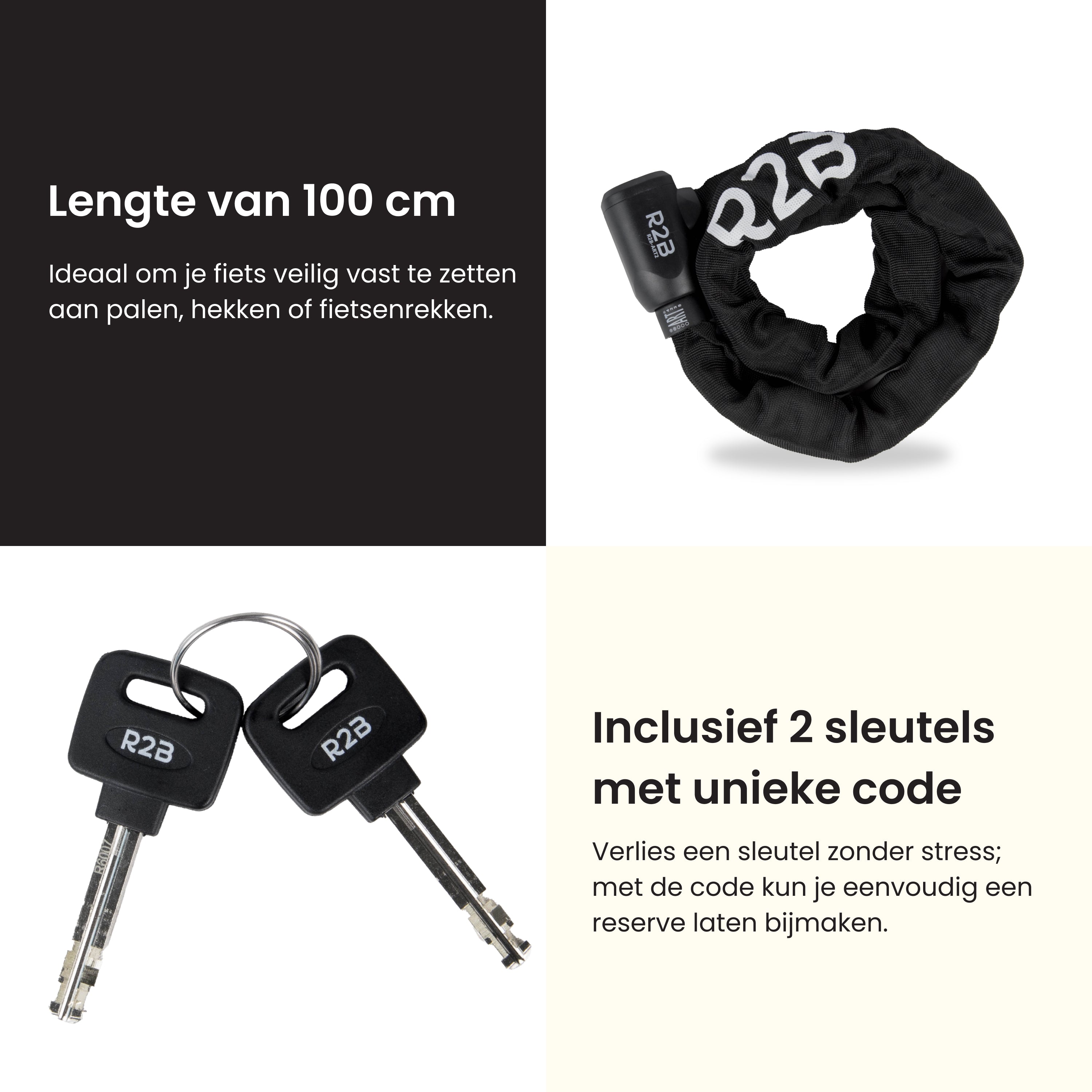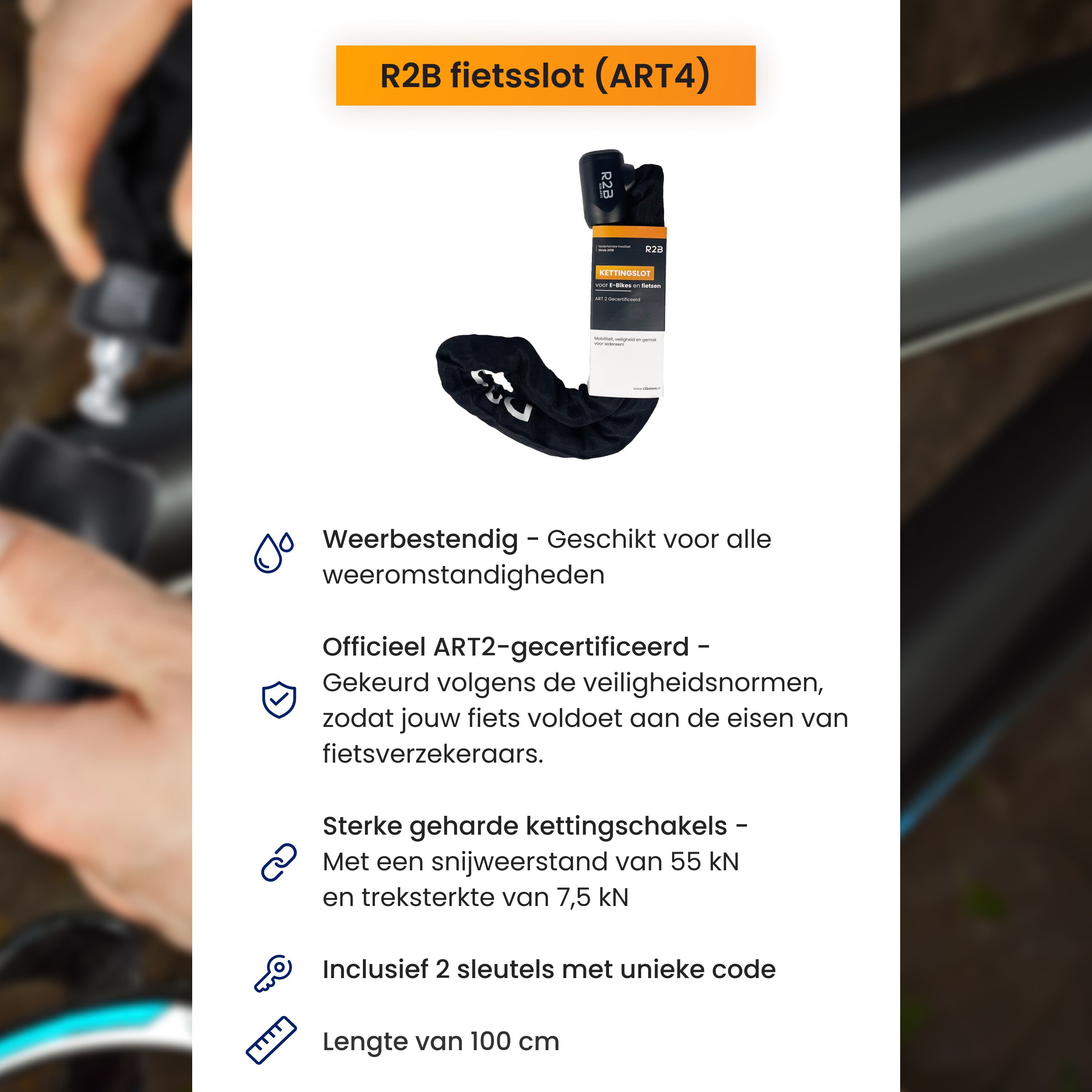 Het R2B Fietsslot heeft de officiële ART2-keuring doorstaan, een keurmerk dat alleen wordt toegekend aan sloten die voldoen aan strenge tests op het gebied van sterkte, duurzaamheid en weerstand tegen diefstal. Met dit keurmerk weet je zeker dat jouw slot niet alleen betrouwbaar is, maar ook voldoet aan alle regelgeving voor fietsverzekeringen. Dit betekent dat je fiets verzekerd kan worden als je het R2B Fietsslot gebruikt.