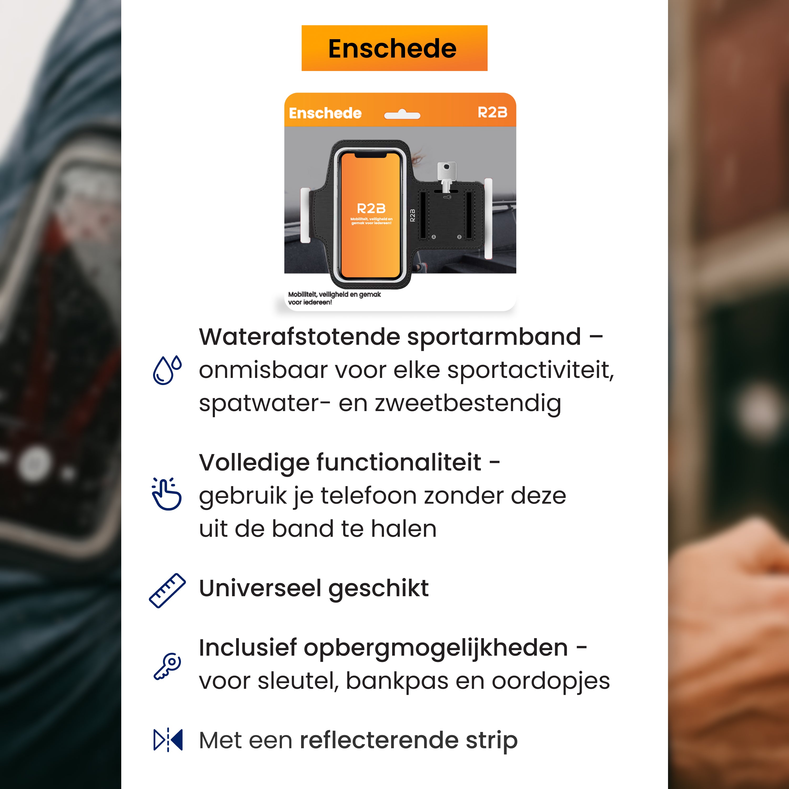 Je telefoon is een onmisbaar hulpmiddel tijdens het sporten, of je nu je prestaties bijhoudt, muziek luistert of zorgt voor extra veiligheid. Maar waar laat je je mobiel tijdens het hardlopen of in de sportschool? De R2B sportarmband model "Enschede" biedt een stevige en waterdichte oplossing, zodat je telefoon veilig en comfortabel op zijn plek blijft terwijl jij je op je training concentreert!