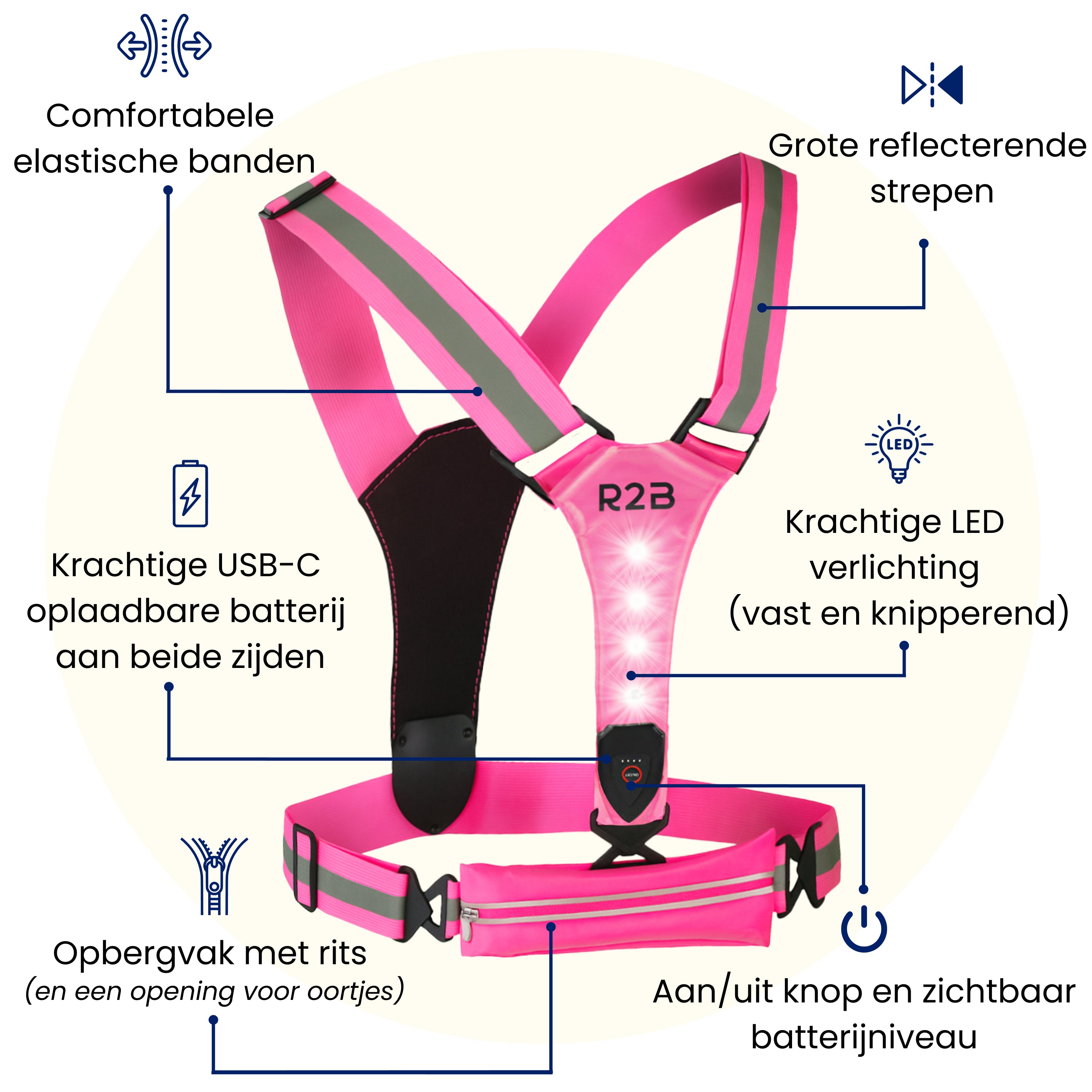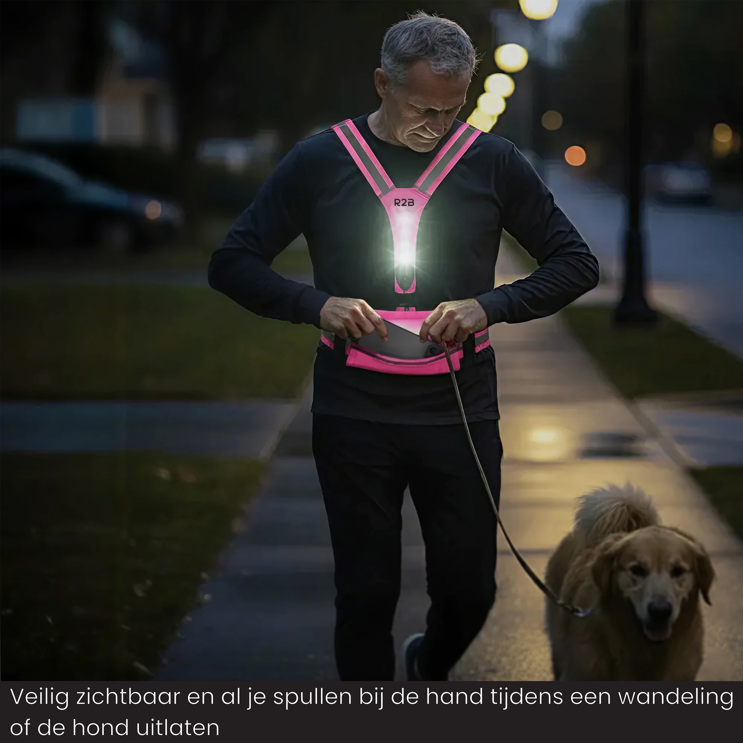 1x R2B reflecterend hardloopvest met verlichting en opbergvak (Roze)