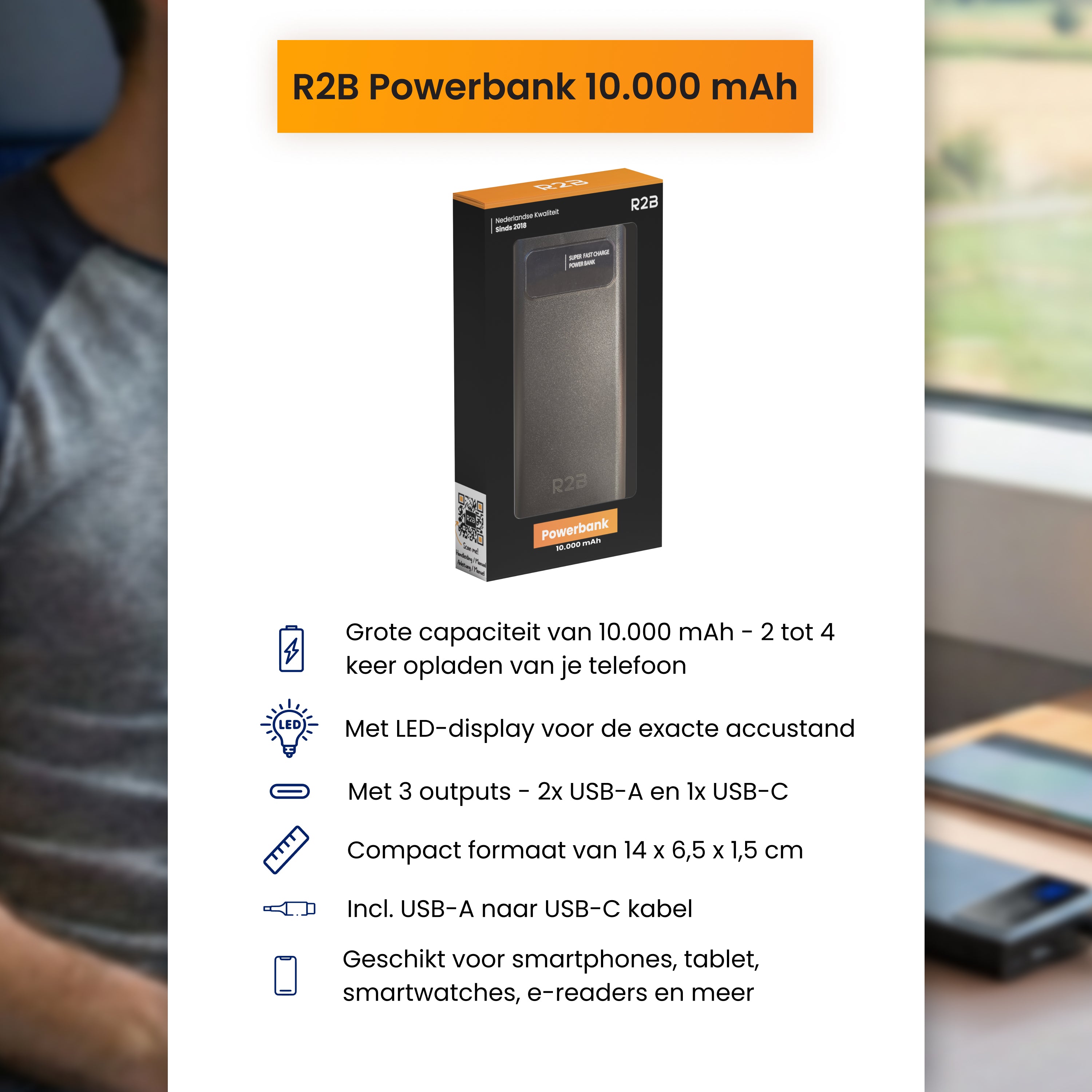 Wil je je apparaten eenvoudig en snel opladen? Deze powerbank biedt een betrouwbare en efficiënte oplossing, zodat je altijd van voldoende energie bent voorzien. Bekijk hier het hele assortiment powerbanks van R2B Store.