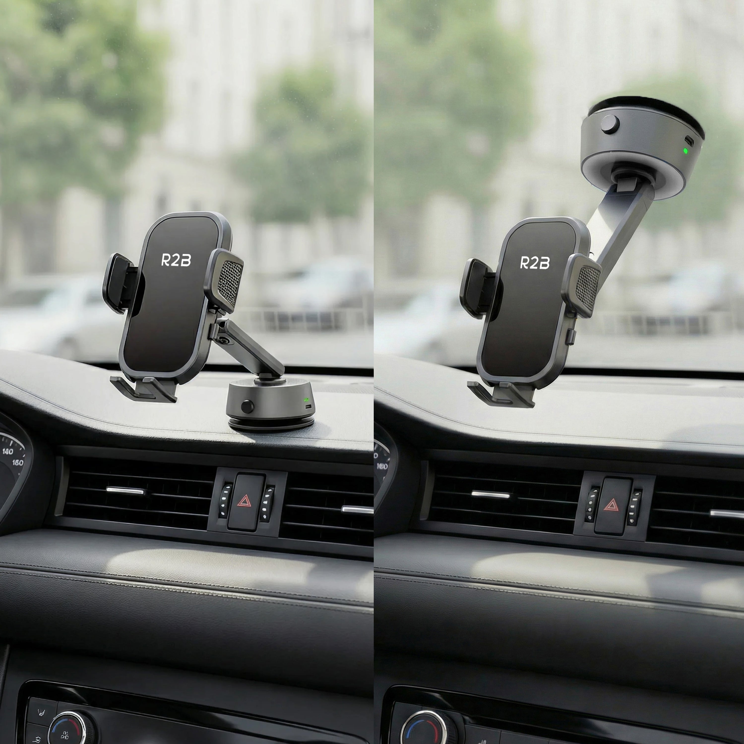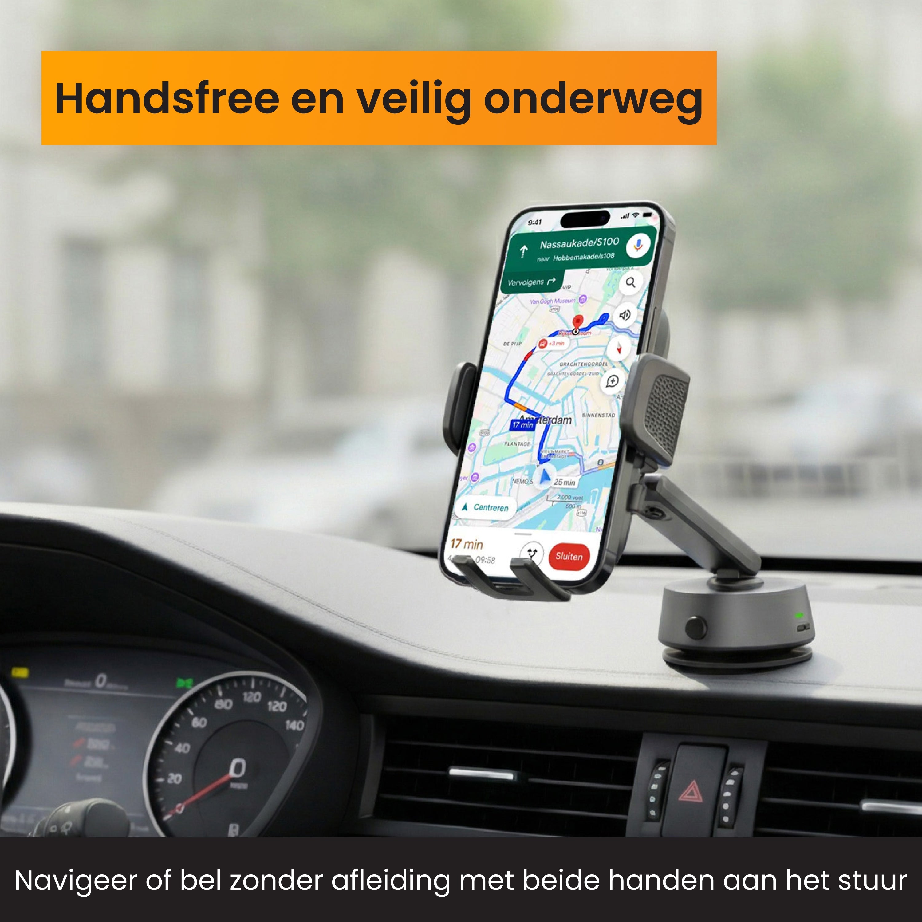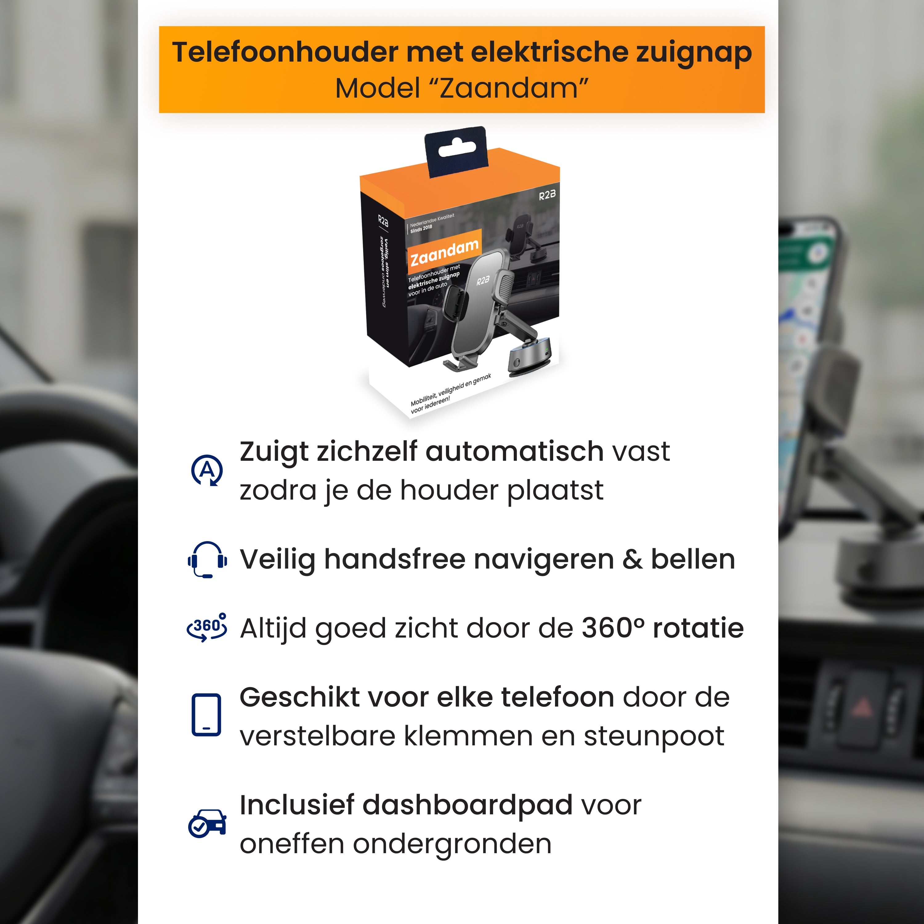 Gebruik jij je telefoon ook als navigatie onderweg? Dan weet je hoe belangrijk het is dat je toestel stevig en veilig vastzit. Handsfree rijden is niet alleen veiliger, het voorkomt ook onnodige boetes en afleiding. De R2B elektrische telefoonhouder model "Zaandam" maakt elke autorit eenvoudiger, comfortabeler en veiliger. Dankzij de slimme elektrische zuignap bevestig je hem in één beweging op je raam of dashboard. Hij hecht zichzelf automatisch vast, zelfs op ruwe of gebogen oppervlakken. Geen gedoe met lijm of plaklagen, gewoon direct klaar om te rijden!