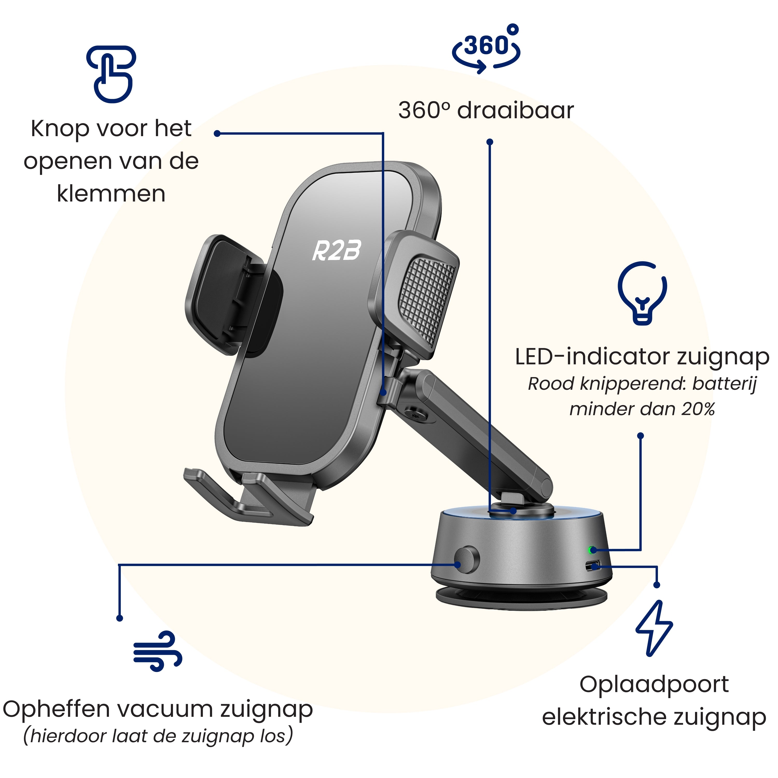 Met de R2B telefoonhouder "Zaandam" profiteer je van de krachtige elektrische zuignap die zorgt voor een stabiele en veilige bevestiging, elke rit opnieuw! Bekijk hier alle telefoonhouders voor in de auto.