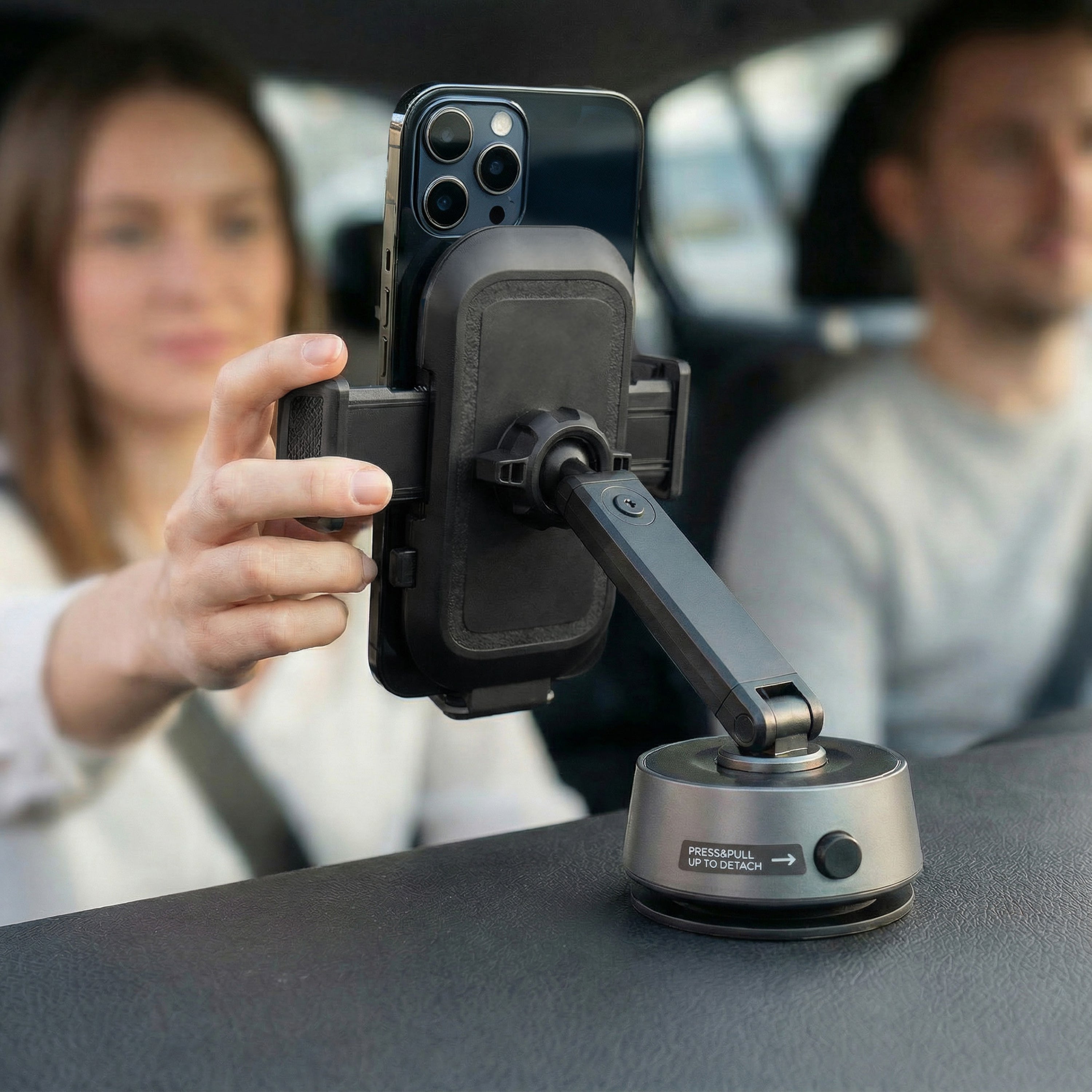 Nooit meer gedoe met kleeflagen of zuignappen die loslaten. De elektrische zuignap zuigt zichzelf automatisch vast zodra je de houder plaatst. Dankzij de krachtige vacuümtechnologie blijft hij stevig zitten, ook bij trillingen, bochten of een ongelijk dashboard. Wil je hem verwijderen? Druk op de knop aan de zijkant en de zuignap laat automatisch los. Zo blijft je dashboard schoon en onbeschadigd.