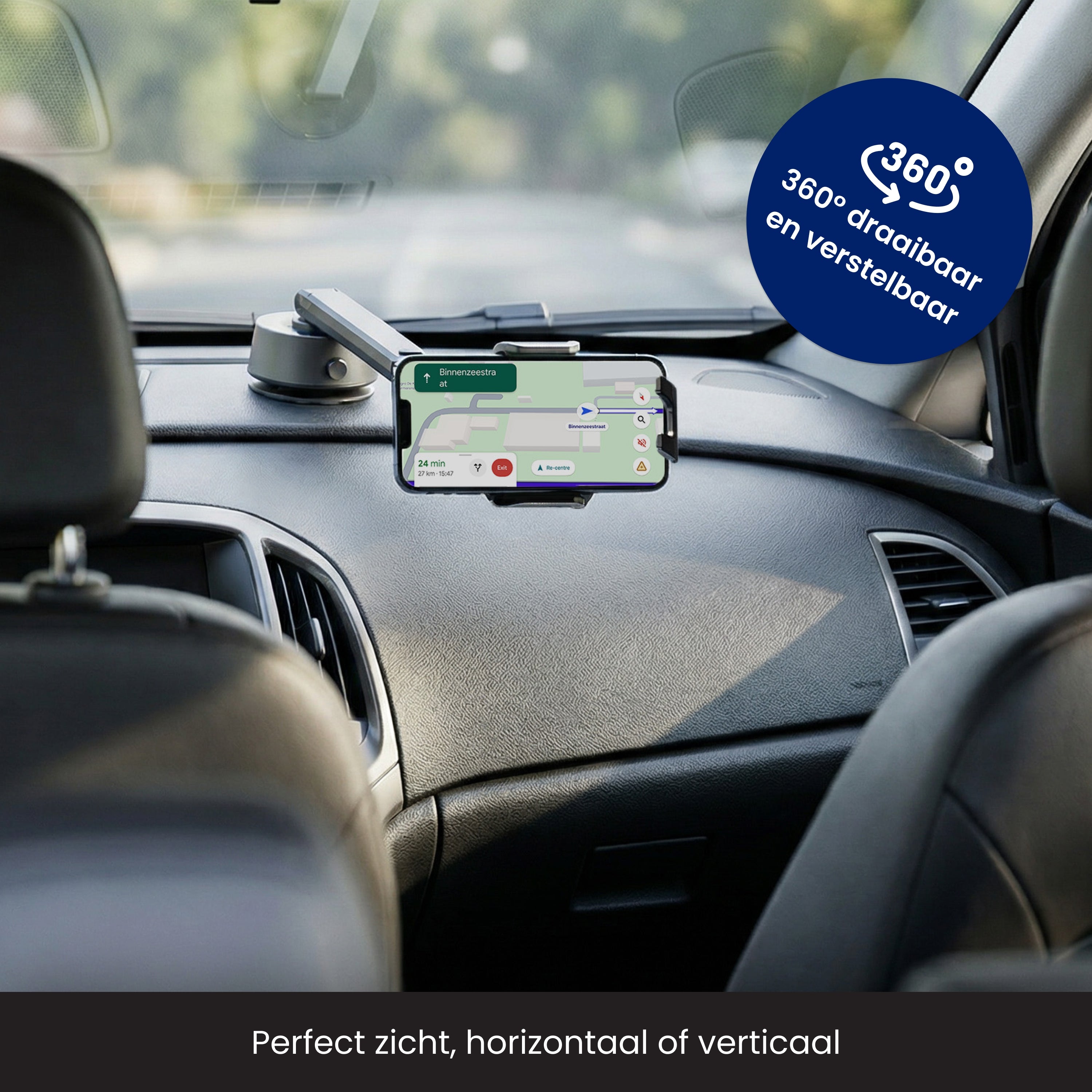 Of je de houder nu op het raam of dashboard plaatst, je bepaalt zelf de ideale kijkhoek. De telescopische arm is volledig 360 graden draaibaar en verstelbaar in lengte en hoogte, zodat je het scherm altijd goed kunt zien. Daarnaast kun je de houder zelf ook 360 graden draaien, zodat je de telefoon zowel verticaal als horizontaal kunt gebruiken. Ideaal voor navigeren, bellen of muziek luisteren onderweg.