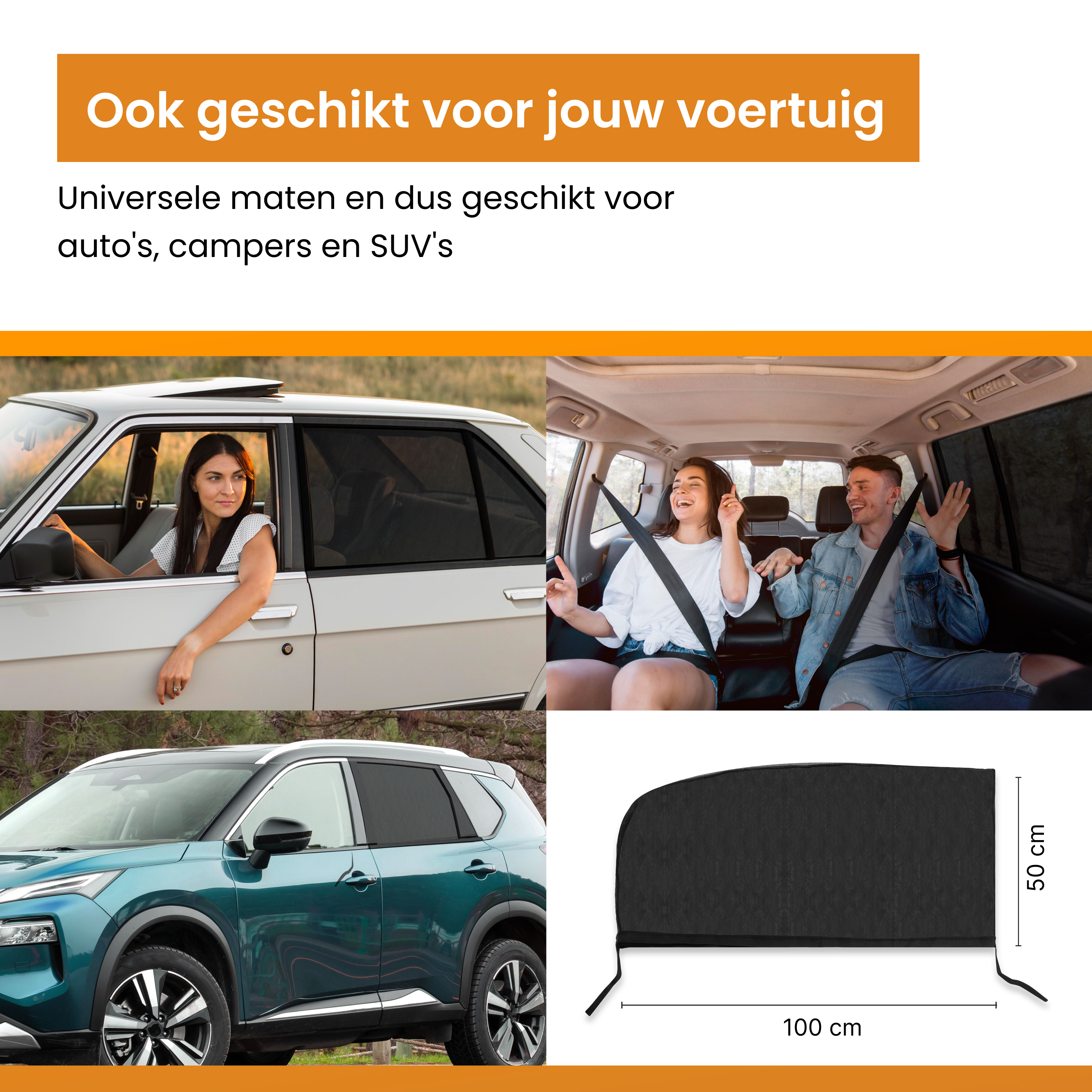 Het zonnescherm heeft een universele pasvorm vanwege zijn elastische materiaal, waardoor het geschikt is voor de meeste voertuigen, inclusief auto's, campers en SUV's. Dankzij dit praktische formaat past het zonnescherm gemakkelijk op de zijruiten van verschillende automodellen en bedekt de hele autoruit, waardoor je verzekerd bent van een flexibele en efficiënte oplossing voor het beschermen van je inzittenden tegen zonlicht en hitte. Of je nu een compacte auto of een grotere SUV hebt, dit zonnescherm biedt de ideale combinatie van bescherming en gebruiksgemak.
